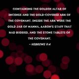containing the golden altar of incense and the gold-covered ark of the covenant. Inside the ark were the gold jar of manna, Aaron's staff that had budded, and the stone tablets of the covenant.
