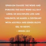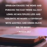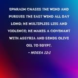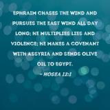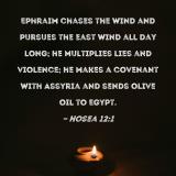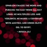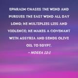 Ephraim chases the wind and pursues the east wind all day long; he multiplies lies and violence; he makes a covenant with Assyria and sends olive oil to Egypt.
