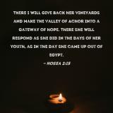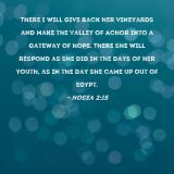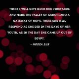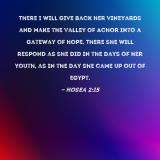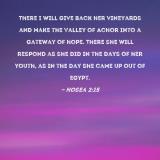 There I will give back her vineyards and make the Valley of Achor into a gateway of hope. There she will respond as she did in the days of her youth, as in the day she came up out of Egypt.