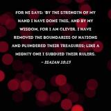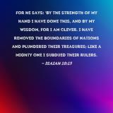 For he says: 'By the strength of my hand I have done this, and by my wisdom, for I am clever. I have removed the boundaries of nations and plundered their treasures; like a mighty one I subdued their rulers.