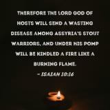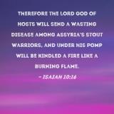 Therefore the Lord GOD of Hosts will send a wasting disease among Assyria's stout warriors, and under his pomp will be kindled a fire like a burning flame.