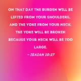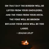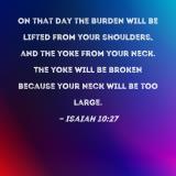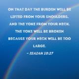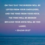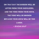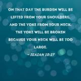 On that day the burden will be lifted from your shoulders, and the yoke from your neck. The yoke will be broken because your neck will be too large.