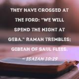 They have crossed at the ford: "We will spend the night at Geba." Ramah trembles; Gibeah of Saul flees.