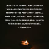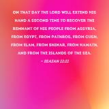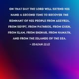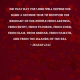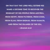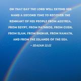 On that day the Lord will extend His hand a second time to recover the remnant of His people from Assyria, from Egypt, from Pathros, from Cush, from Elam, from Shinar, from Hamath, and from the islands of the sea.