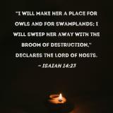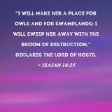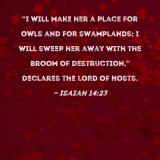 "I will make her a place for owls and for swamplands; I will sweep her away with the broom of destruction," declares the LORD of Hosts.
