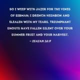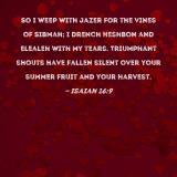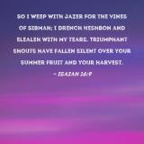 So I weep with Jazer for the vines of Sibmah; I drench Heshbon and Elealeh with my tears. Triumphant shouts have fallen silent over your summer fruit and your harvest.
