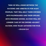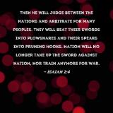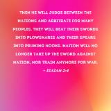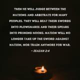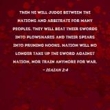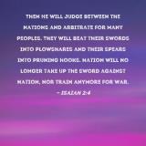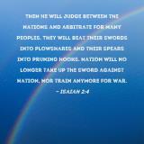 Pictures and Artwork Then He will judge between the nations and arbitrate for many peoples. They will beat their swords into plowshares and their spears into pruning hooks. Nation will no longer take up the sword against nation, nor train anymore for war. |