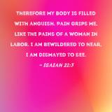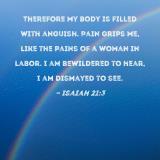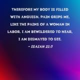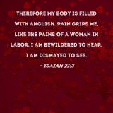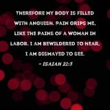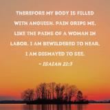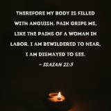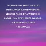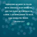 Therefore my body is filled with anguish. Pain grips me, like the pains of a woman in labor. I am bewildered to hear, I am dismayed to see.
