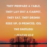 They prepare a table, they lay out a carpet, they eat, they drink! Rise up, O princes, oil the shields!