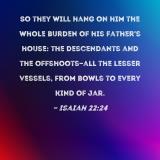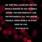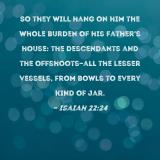 So they will hang on him the whole burden of his father's house: the descendants and the offshoots--all the lesser vessels, from bowls to every kind of jar.