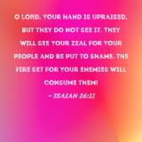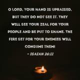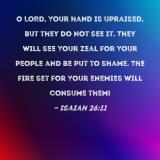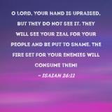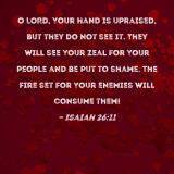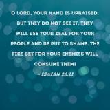 O LORD, Your hand is upraised, but they do not see it. They will see Your zeal for Your people and be put to shame. The fire set for Your enemies will consume them!