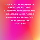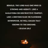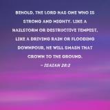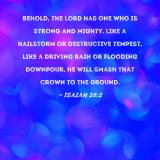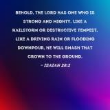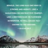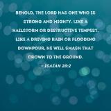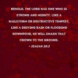 Behold, the Lord has one who is strong and mighty. Like a hailstorm or destructive tempest, like a driving rain or flooding downpour, he will smash that crown to the ground.