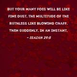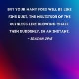But your many foes will be like fine dust, the multitude of the ruthless like blowing chaff. Then suddenly, in an instant,