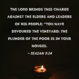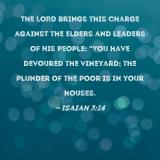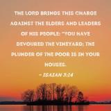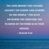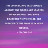 The LORD brings this charge against the elders and leaders of His people: "You have devoured the vineyard; the plunder of the poor is in your houses.