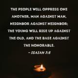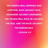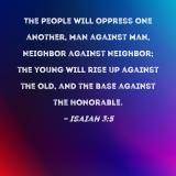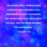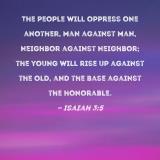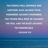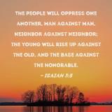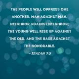 The people will oppress one another, man against man, neighbor against neighbor; the young will rise up against the old, and the base against the honorable.