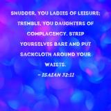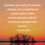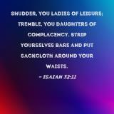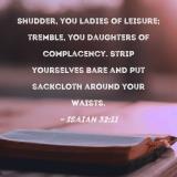 Shudder, you ladies of leisure; tremble, you daughters of complacency. Strip yourselves bare and put sackcloth around your waists.