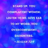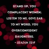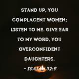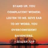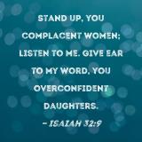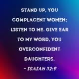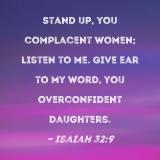 Stand up, you complacent women; listen to me. Give ear to my word, you overconfident daughters.