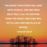 The desert creatures will meet with hyenas, and one wild goat will call to another. There the night creature will settle and find her place of repose.
