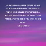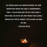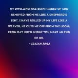 My dwelling has been picked up and removed from me like a shepherd's tent. I have rolled up my life like a weaver; He cuts me off from the loom; from day until night You make an end of me.