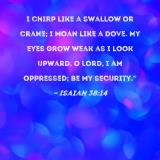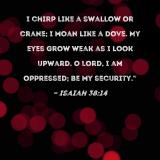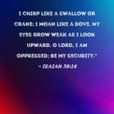 I chirp like a swallow or crane; I moan like a dove. My eyes grow weak as I look upward. O Lord, I am oppressed; be my security."