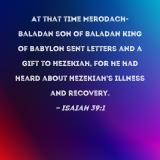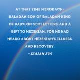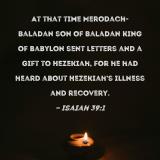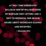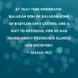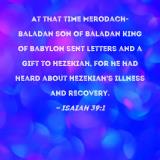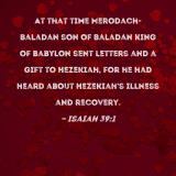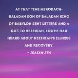 At that time Merodach-baladan son of Baladan king of Babylon sent letters and a gift to Hezekiah, for he had heard about Hezekiah's illness and recovery.