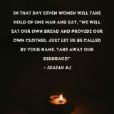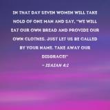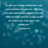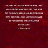 In that day seven women will take hold of one man and say, "We will eat our own bread and provide our own clothes. Just let us be called by your name. Take away our disgrace!"