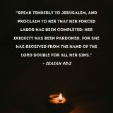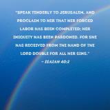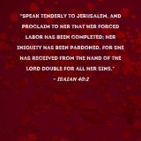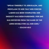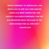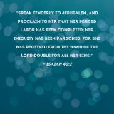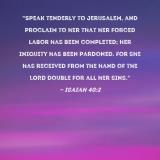 "Speak tenderly to Jerusalem, and proclaim to her that her forced labor has been completed; her iniquity has been pardoned. For she has received from the hand of the LORD double for all her sins."