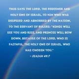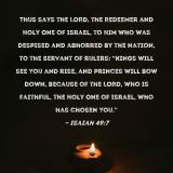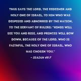 Pictures and Artwork Thus says the LORD, the Redeemer and Holy One of Israel, to Him who was despised and abhorred by the nation, to the Servant of rulers: "Kings will see You and rise, and princes will bow down, because of the LORD, who is faithful, the Holy One of Israel, who has chosen You." |