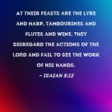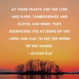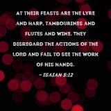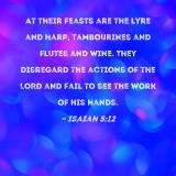 At their feasts are the lyre and harp, tambourines and flutes and wine. They disregard the actions of the LORD and fail to see the work of His hands.