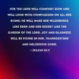 Pictures and Artwork For the LORD will comfort Zion and will look with compassion on all her ruins; He will make her wilderness like Eden and her desert like the garden of the LORD. Joy and gladness will be found in her, thanksgiving and melodious song. |