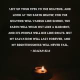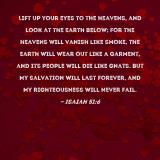 Pictures and Artwork Lift up your eyes to the heavens, and look at the earth below; for the heavens will vanish like smoke, the earth will wear out like a garment, and its people will die like gnats. But My salvation will last forever, and My righteousness will never fail. |