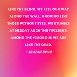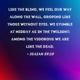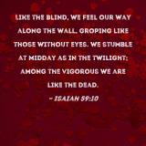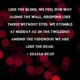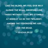 Like the blind, we feel our way along the wall, groping like those without eyes. We stumble at midday as in the twilight; among the vigorous we are like the dead.