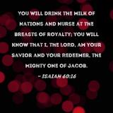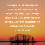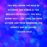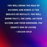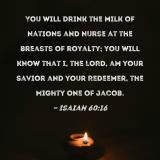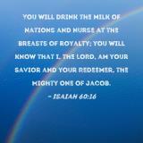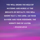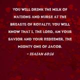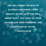 You will drink the milk of nations and nurse at the breasts of royalty; you will know that I, the LORD, am your Savior and your Redeemer, the Mighty One of Jacob.