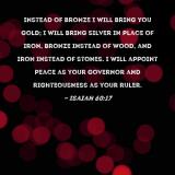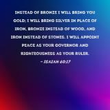 Instead of bronze I will bring you gold; I will bring silver in place of iron, bronze instead of wood, and iron instead of stones. I will appoint peace as your governor and righteousness as your ruler.
