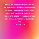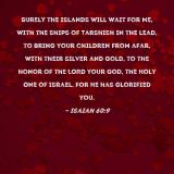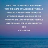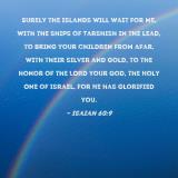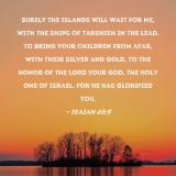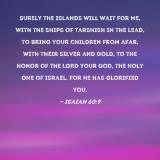 Surely the islands will wait for Me, with the ships of Tarshish in the lead, to bring your children from afar, with their silver and gold, to the honor of the LORD your God, the Holy One of Israel, for He has glorified you.