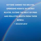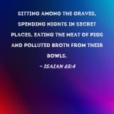 sitting among the graves, spending nights in secret places, eating the meat of pigs and polluted broth from their bowls.