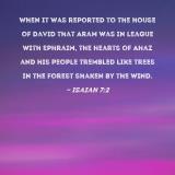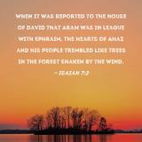 When it was reported to the house of David that Aram was in league with Ephraim, the hearts of Ahaz and his people trembled like trees in the forest shaken by the wind.