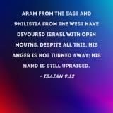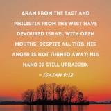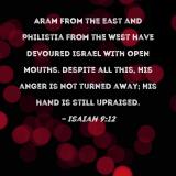Aram from the east and Philistia from the west have devoured Israel with open mouths. Despite all this, His anger is not turned away; His hand is still upraised.