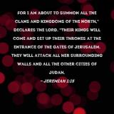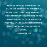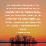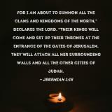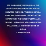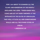 Pictures and Artwork For I am about to summon all the clans and kingdoms of the north," declares the LORD. "Their kings will come and set up their thrones at the entrance of the gates of Jerusalem. They will attack all her surrounding walls and all the other cities of Judah. |