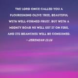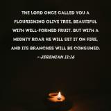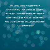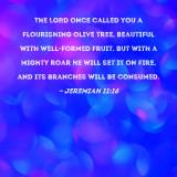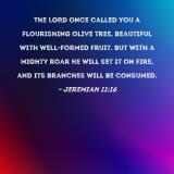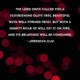 The LORD once called you a flourishing olive tree, beautiful with well-formed fruit. But with a mighty roar He will set it on fire, and its branches will be consumed.