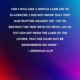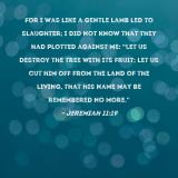 For I was like a gentle lamb led to slaughter; I did not know that they had plotted against me: "Let us destroy the tree with its fruit; let us cut him off from the land of the living, that his name may be remembered no more."