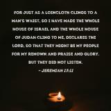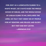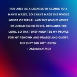 Pictures and Artwork For just as a loincloth clings to a man's waist, so I have made the whole house of Israel and the whole house of Judah cling to Me, declares the LORD, so that they might be My people for My renown and praise and glory. But they did not listen. |