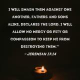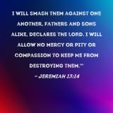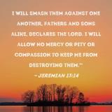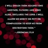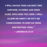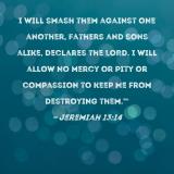 I will smash them against one another, fathers and sons alike, declares the LORD. I will allow no mercy or pity or compassion to keep Me from destroying them.'"