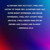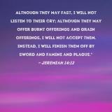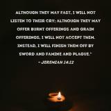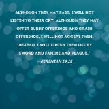 Although they may fast, I will not listen to their cry; although they may offer burnt offerings and grain offerings, I will not accept them. Instead, I will finish them off by sword and famine and plague."