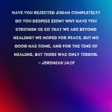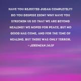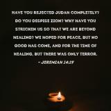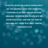 Have You rejected Judah completely? Do You despise Zion? Why have You stricken us so that we are beyond healing? We hoped for peace, but no good has come, and for the time of healing, but there was only terror.