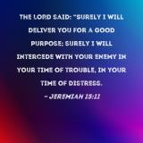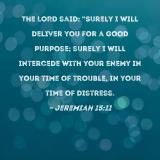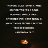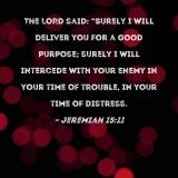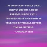 The LORD said: "Surely I will deliver you for a good purpose; surely I will intercede with your enemy in your time of trouble, in your time of distress.