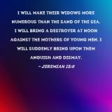 I will make their widows more numerous than the sand of the sea. I will bring a destroyer at noon against the mothers of young men. I will suddenly bring upon them anguish and dismay.