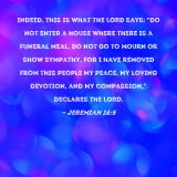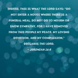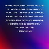 Pictures and Artwork Indeed, this is what the LORD says: "Do not enter a house where there is a funeral meal. Do not go to mourn or show sympathy, for I have removed from this people My peace, My loving devotion, and My compassion," declares the LORD. |