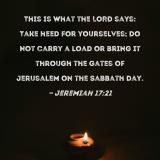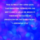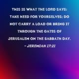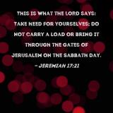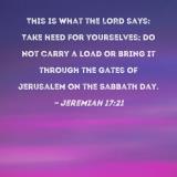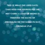 This is what the LORD says: Take heed for yourselves; do not carry a load or bring it through the gates of Jerusalem on the Sabbath day.