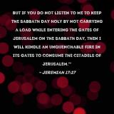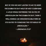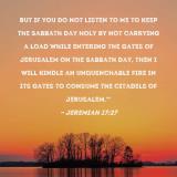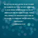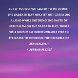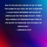Pictures and Artwork But if you do not listen to Me to keep the Sabbath day holy by not carrying a load while entering the gates of Jerusalem on the Sabbath day, then I will kindle an unquenchable fire in its gates to consume the citadels of Jerusalem.'" |